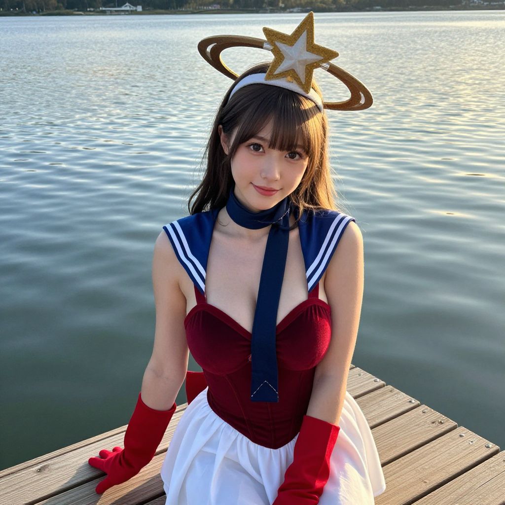 A realistic photo of a young woman in a whimsical sailor Saturn costume, featuring a sailor-style dress with a deep red bodice, a white sailor skirt, and a star-shaped crown with Saturn’s rings, wearing red gloves and a navy scarf, posing on a wooden dock overlooking a calm lake at golden hour, her face youthful and joyful with bright eyes and a soft smile, natural sunlight reflecting on the water. The woman has big tits and cute face