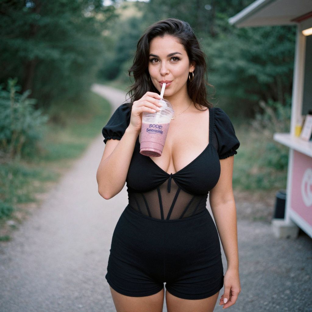 A Pear-shaped body type woman in a black romper with sheer panel details and short puff sleeves, captured in the soft focus of a Holga camera, is enjoying a refreshing smoothie at a Smoothie Stand on a Hiking Trail, smiling as she takes a sip. Sexy. Pretty face and beаutiful eyes. Big breasts