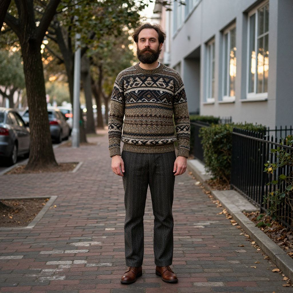 A man with a full beard and a well-groomed mustache stands confidently on a weathered brick sidewalk, wearing a warm, cozy sweater with a bold geometric pattern and classic striped pants. His brown hair is slightly tousled, adding to his approachable and grounded look, and he wears brown leather shoes that match the earthy tones of his outfit. The scene is set in a quiet urban neighborhood, with tall trees lining the street and a modern building in the background, its windows reflecting the soft afternoon light. The atmosphere is peaceful and slightly nostalgic, with subtle details like falling leaves and distant streetlights adding depth to the image.