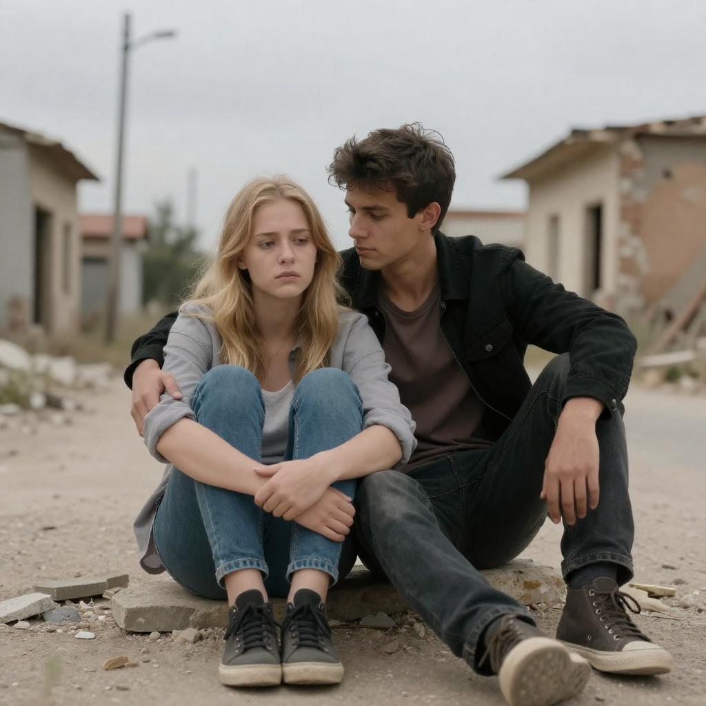 Photograph of a young couple sitting on the ground beside an old, green car in a dimly lit urban street at dusk. The man, with short brown hair and a blue shirt, leans towards the woman, who has long blonde hair and wears a gray dress and white sneakers. They are engaged in a serious conversation. Background includes parked cars, trees, and streetlights.