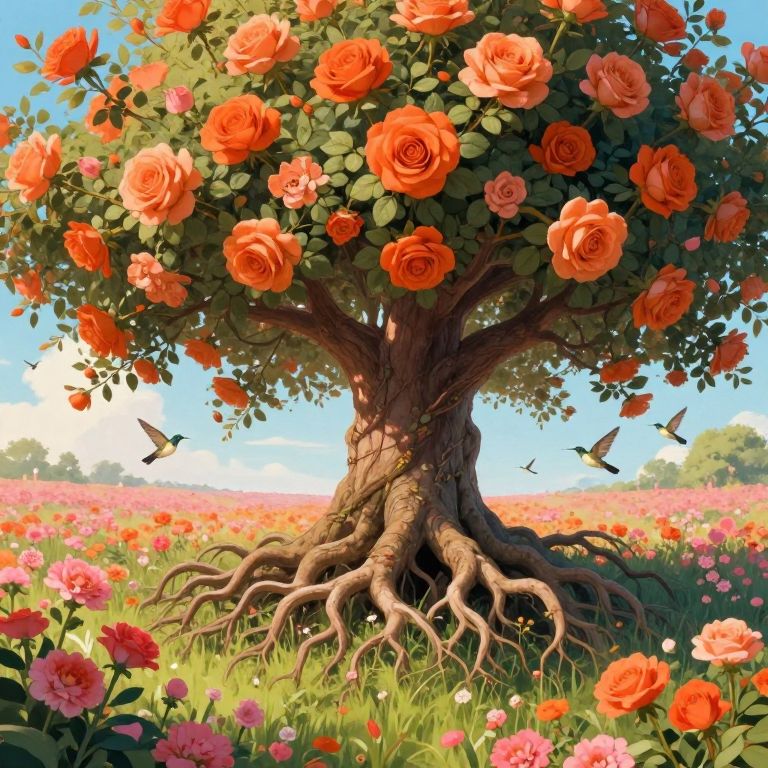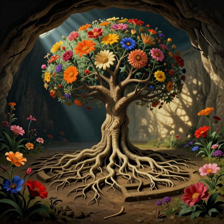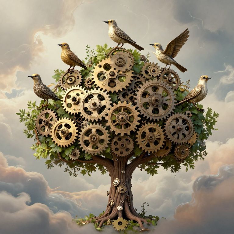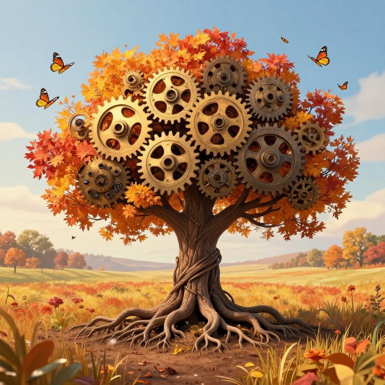 Amidst a field of vibrant autumn hues, a tree adorned with mechanical gears dreams of forgotten eras, its roots intertwining with the earth while butterflies dance around, symbolizing the delicate balance between nature’s serenity and humanity’s quest for understanding.