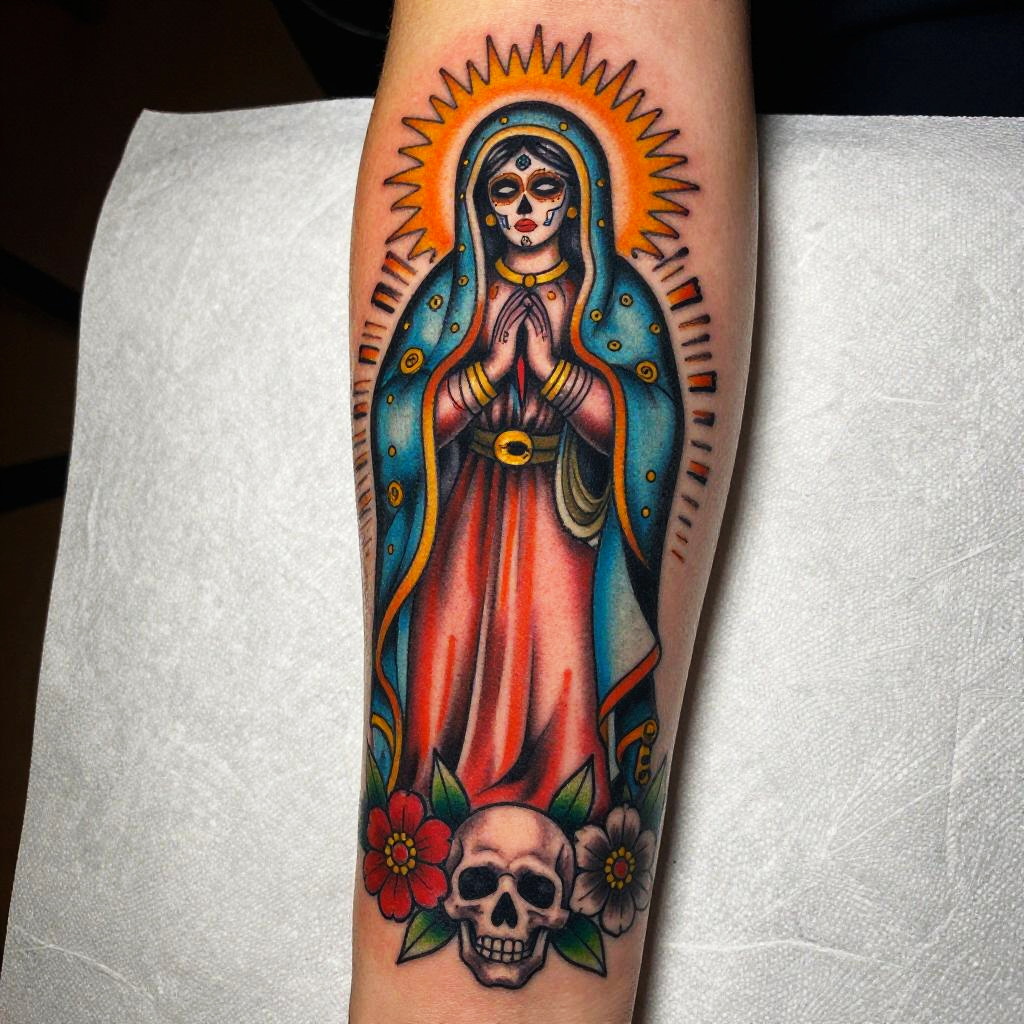 A vibrant Santa Muerte and Virgin Mary tattoo, combining bold colors and fine lines, with emphasis on spiritual elements like skulls, flowers, and divine light, merging modern tattoo art with classic cultural motifs in a dramatic composition.