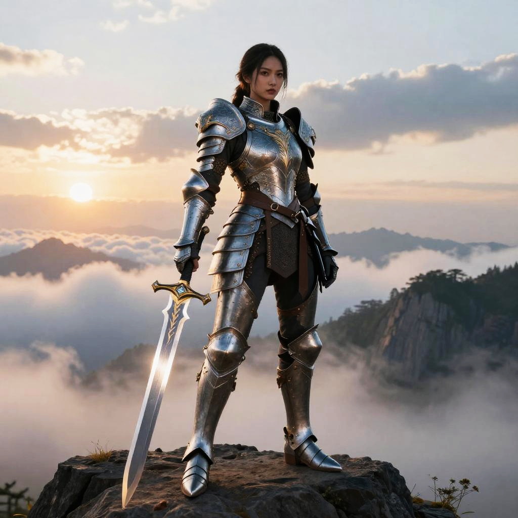 Masterpiece, best quality, highres, 1girl, armor, glowing, holding weapon, (extremely long and wide crystal glowing sword:1.2), glowing particles, (helmet, unevolved:1.2), holy light, dynatic angle, cinematic lighting, lens flare, serious, mid shot, tilting