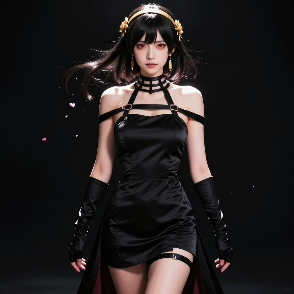 Yor briar, (photorealistic), beautiful girl, backlighting, bare shoulders, black background, black dress, black gloves, black hair, breasts, closed mouth, cowboy shot, dress, earrings, expressionless, fingerless gloves, floating hair, gloves, gold earrings, gold hairband, hair flower, hair ornament, hairband, jewelry, large breasts, light particles, long hair, looking at viewer, off-shoulder dress, off shoulder, petals, red eyes, short hair with long locks, sidelocks, solo, spikes, thighs, two-sided dress, two-sided fabric