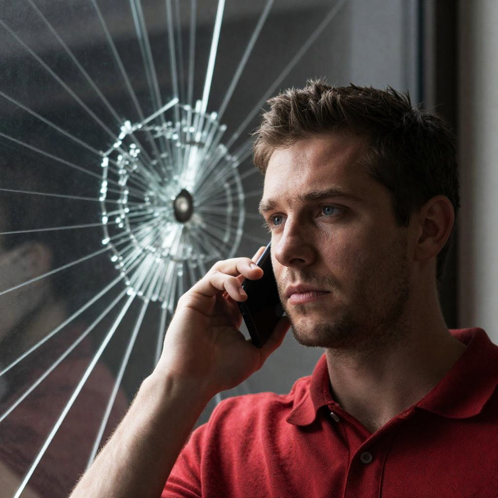 Photograph of a man with short brown hair, light stubble, and a red shirt, holding a phone to his ear. He has a focused expression. Background features a large, cracked glass window with intricate, radiating lines. Man positioned slightly to the right, looking to the left. Dark, indistinct background behind the window.