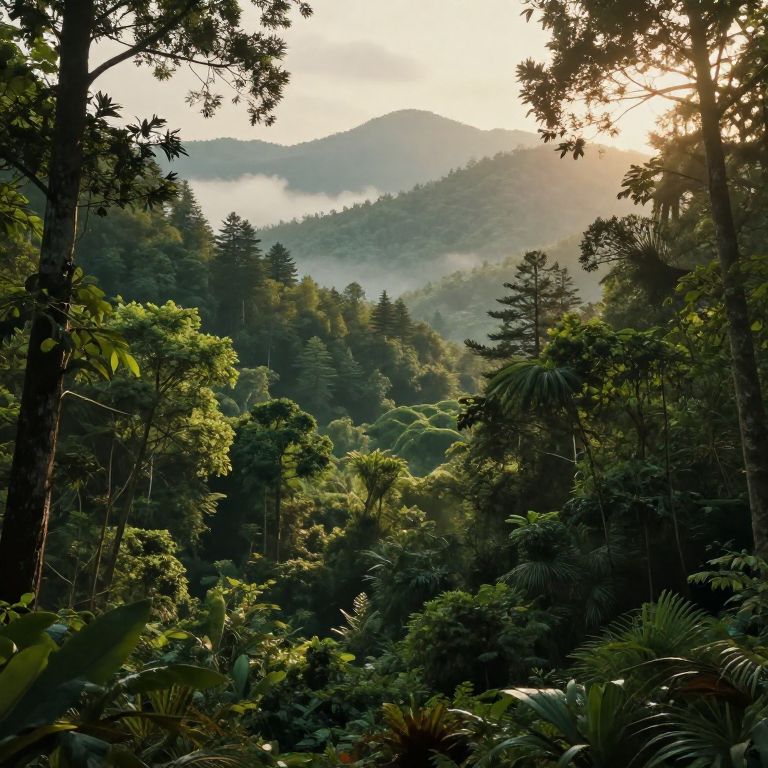 Photograph of a dense, misty forest with tall trees, lush greenery, and mist-covered hills at sunrise, bathed in soft, golden