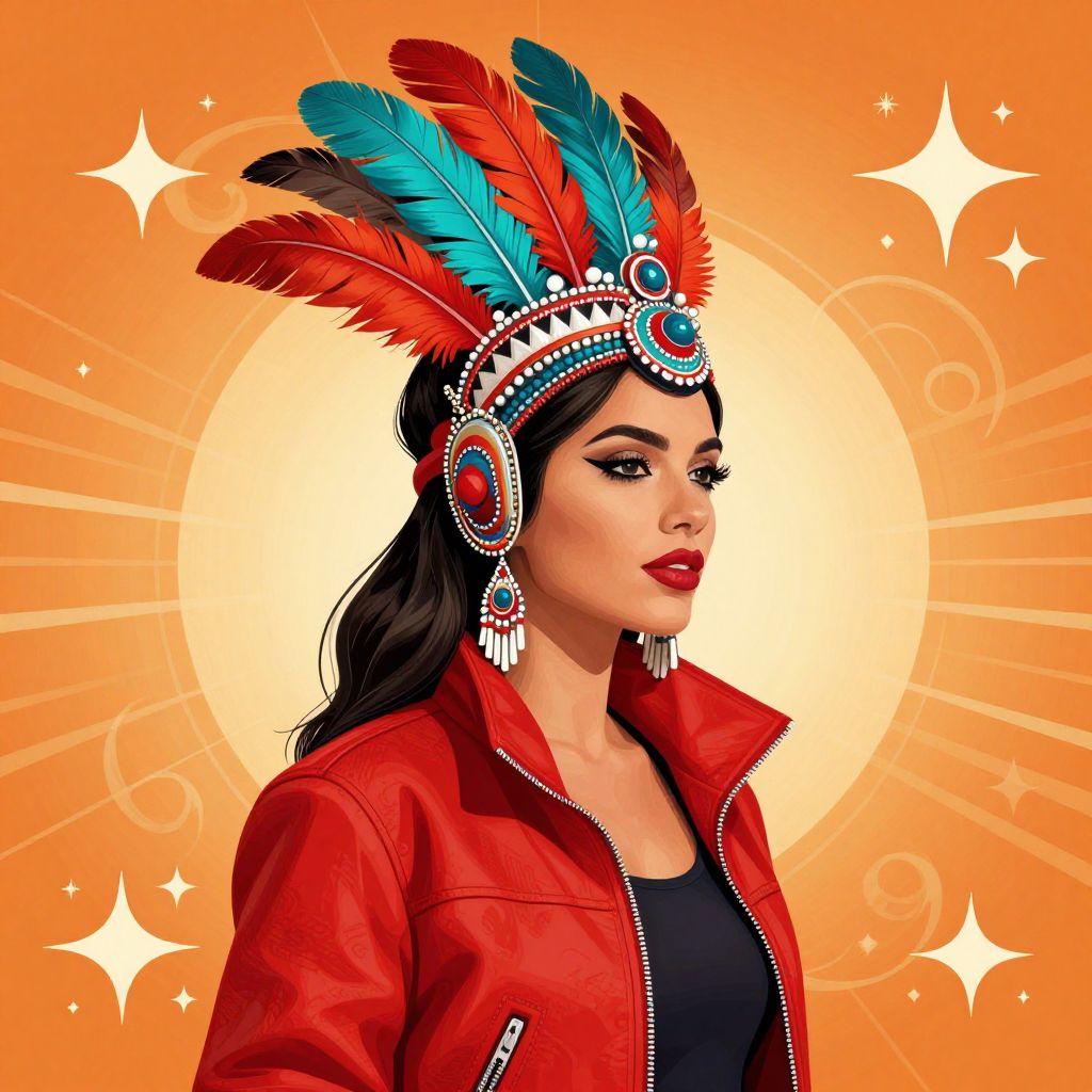 Digital illustration of a Latina woman with red leather jacket, turquoise and red feather headdress, black top, orange background with sunburst.