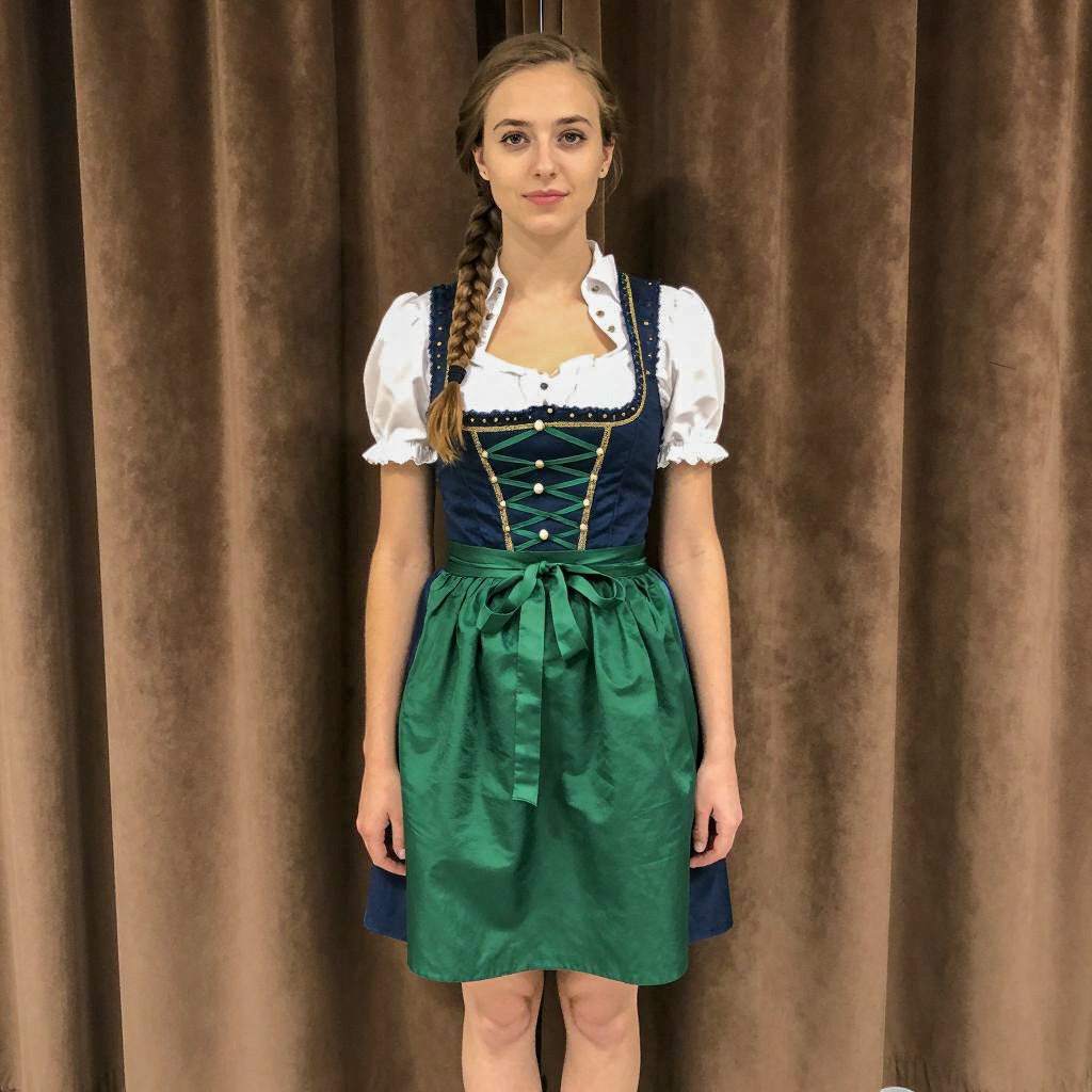 Photograph of a young woman with fair skin and brown braided hair wearing a traditional German dirndl costume. She stands in front of a brown curtain, dressed in a white puffed sleeve blouse, dark blue bodice with white buttons and gold trim, and a green skirt with a matching ribbon tied at the front. The full body shot is taken in natural daylight with a neutral expression in a casual indoor setting.