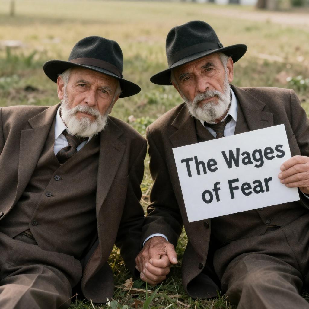 Two elderly men in brown suits and black hats lie on the ground. One holds the other's hand, the other shows a sign reading "The Wages of Fear." Sunlit, grassy background. Both men have beards and serious expressions.