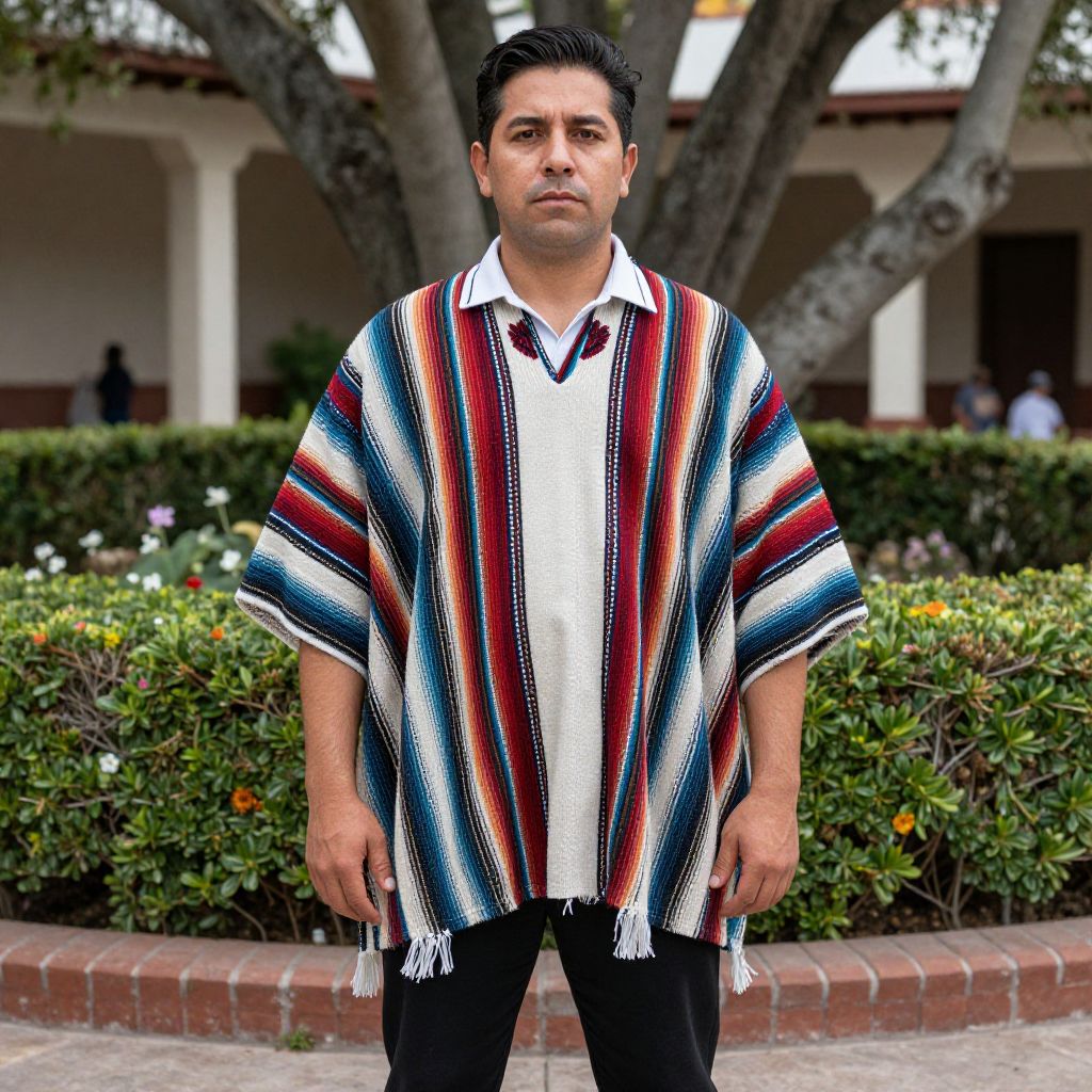 Mexican Costume Poncho, man in a mexican ponchy standing in a garden