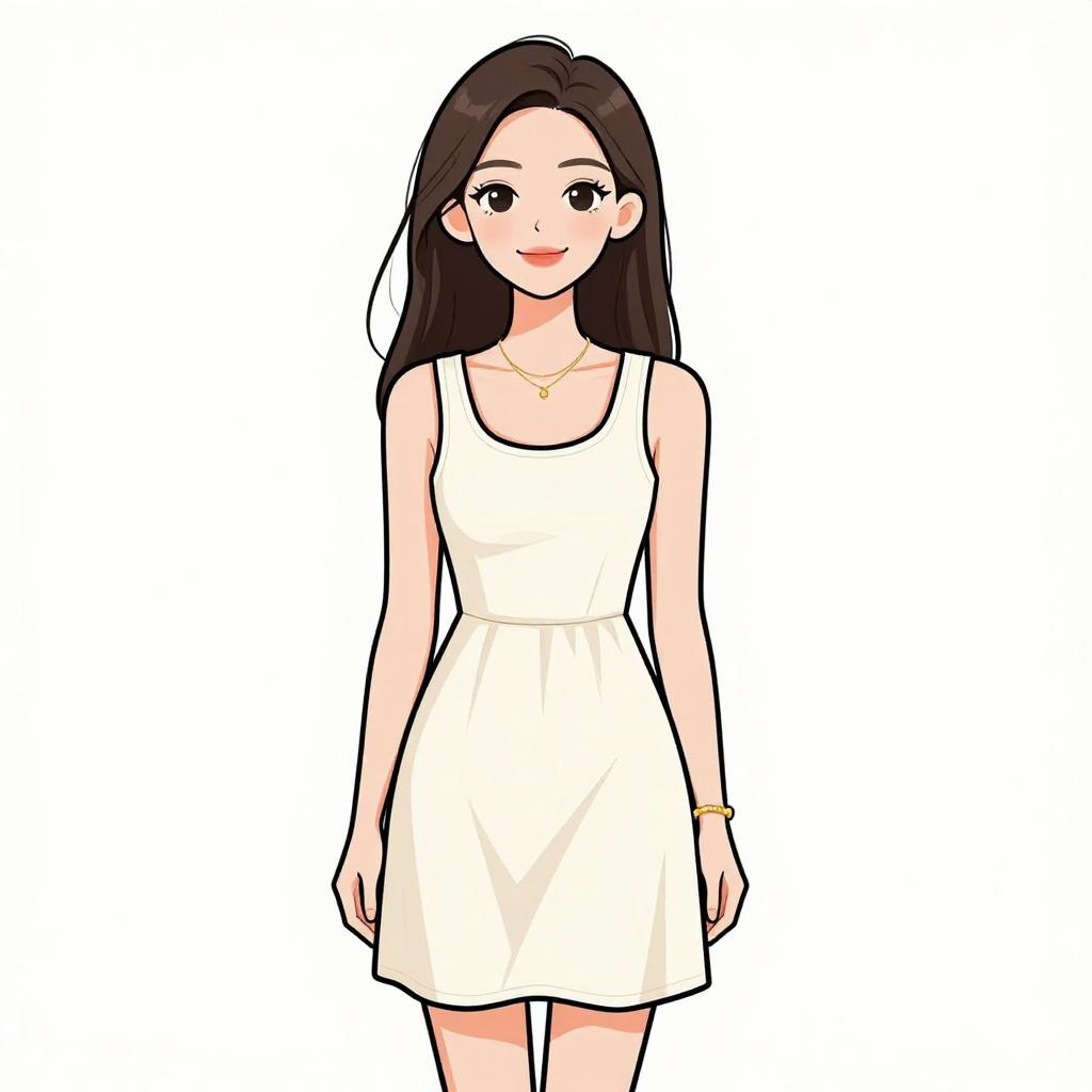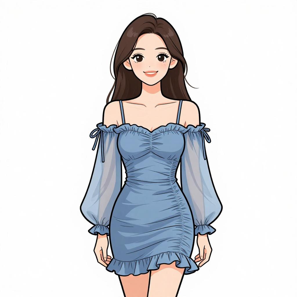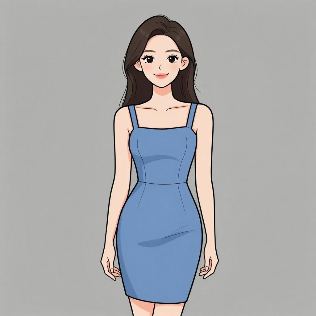 Woman with pretty face and pretty hair. smiling Woman, contemporary casual, royal blue skater dress, cold shoulder design with spaghetti straps, short sleeves, round neckline, fitted bodice, flared skirt, mini length, black opaque tights, minimalistic silver pendant necklace, plain white studio background. --sref 1467
