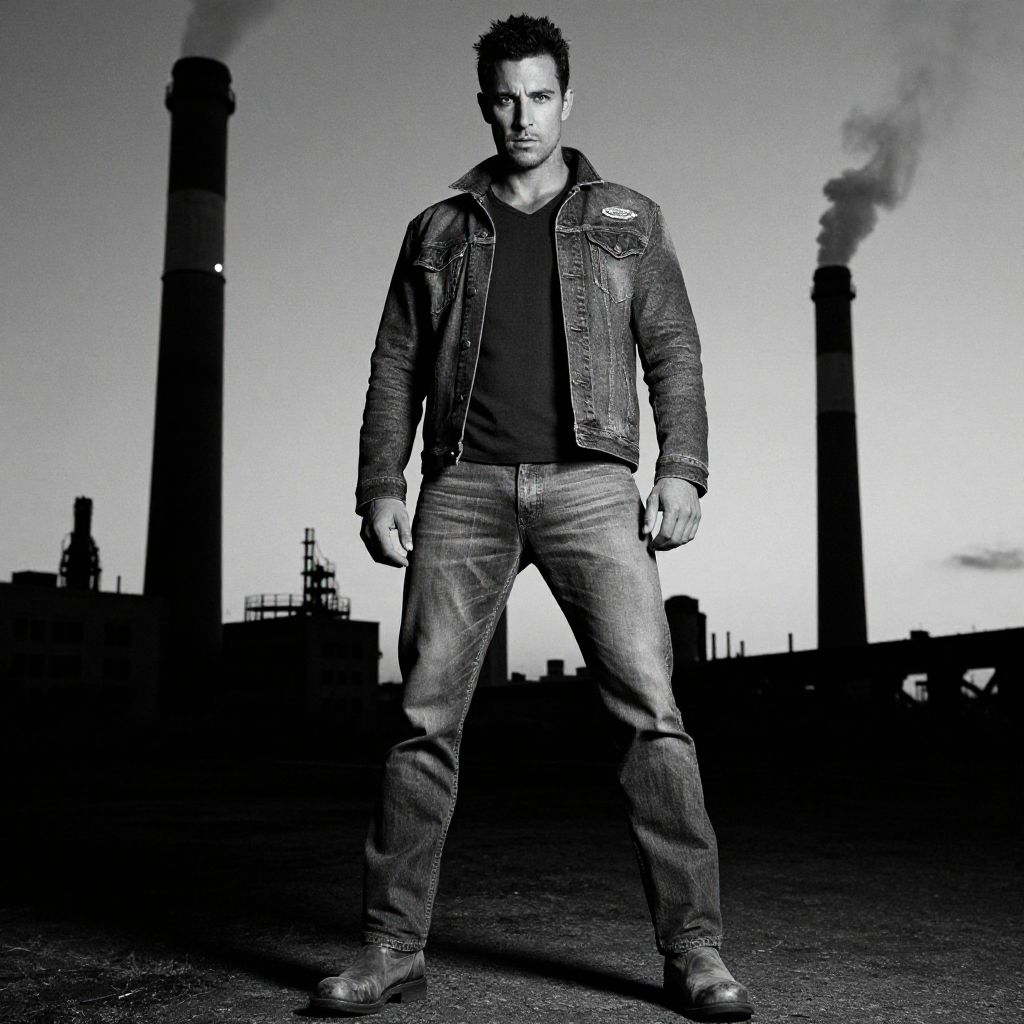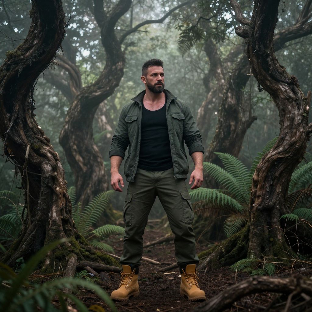 Photograph of a muscular man with short brown hair, wearing a black leather jacket, white t-shirt, green cargo pants, and boots, standing on