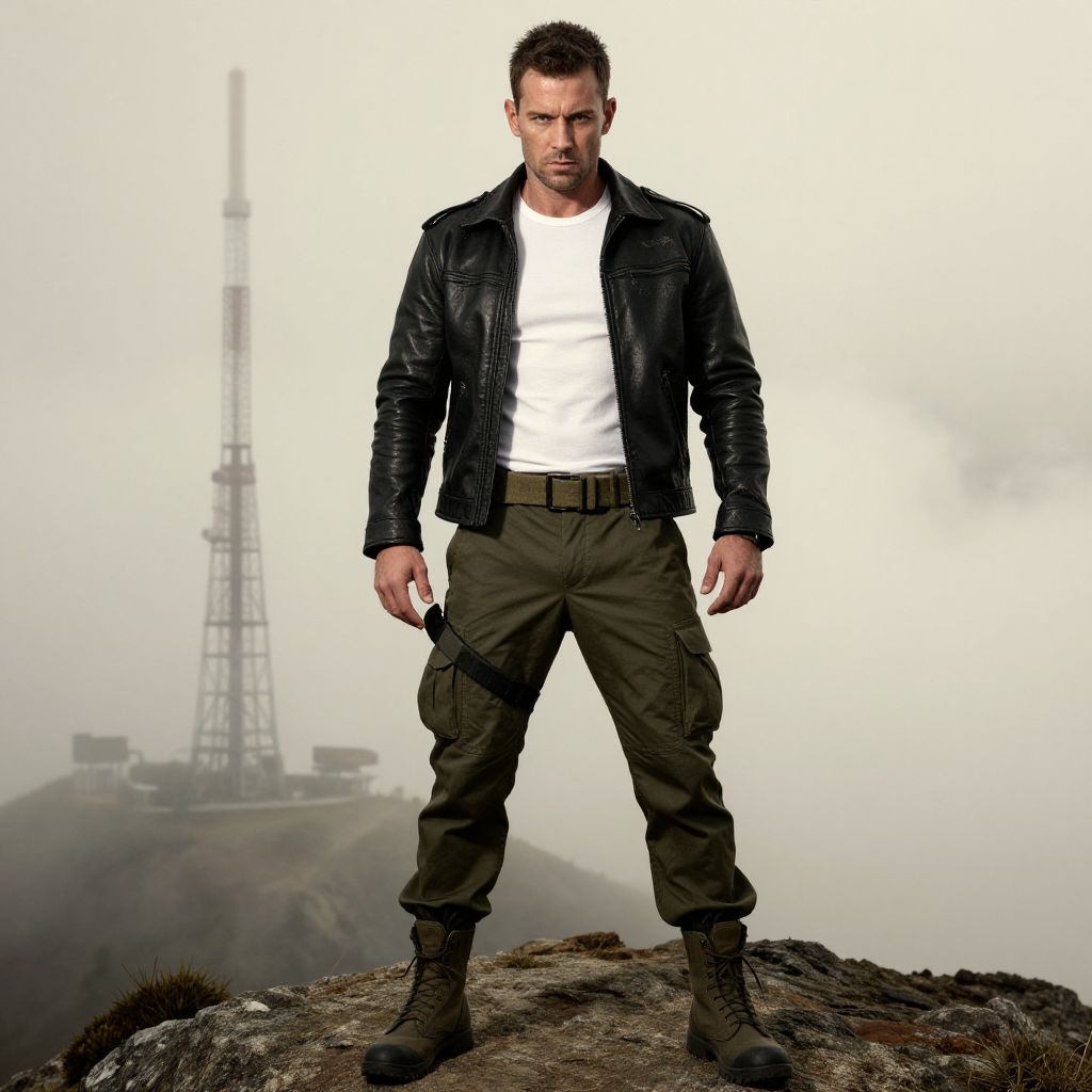 Photograph of a muscular, white man with short brown hair and a serious expression, standing confidently on a rocky cliff. He wears a black leather jacket over a white t-shirt, olive green cargo pants, and black boots. He holds a black pistol in his right hand. The background features a hazy, misty sky with a tall, slender radio tower and some buildings on the left. The image has a dramatic, action-hero vibe with high contrast and a misty, atmospheric setting. The man's stance is strong and assertive, facing the camera directly.