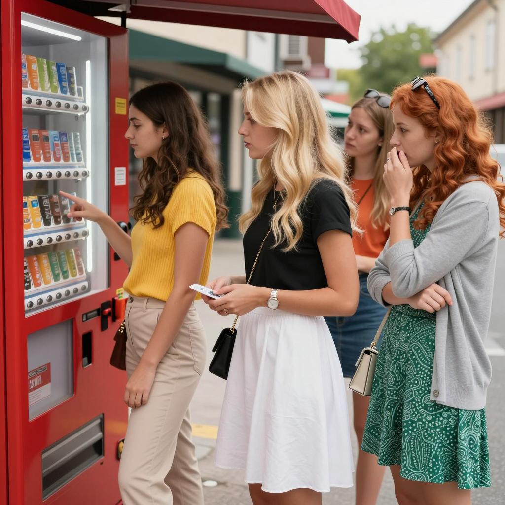 Four women standing near a red vending machine. Left: brown-haired woman in yellow-striped top and beige pants, pointing at the machine. Center: blonde woman in black top and white dress, holding a small card. Right: redhead woman in gray cardigan and green patterned dress, covering her mouth with her hand. Blonde woman in orange top, leaning in from behind. Street and buildings in the background.