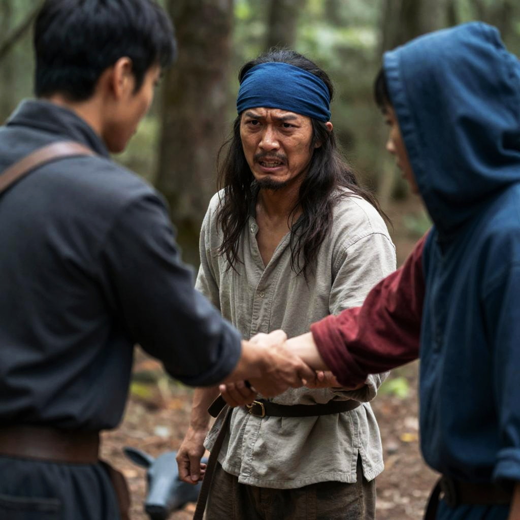 Two men in muddy, dark clothing, outdoors. One kneels with a baseball bat, holding a metal pipe, looking intense. The other lies on the ground, head back, looking distressed. Tall green grass in the background. Mud-covered, rugged setting.