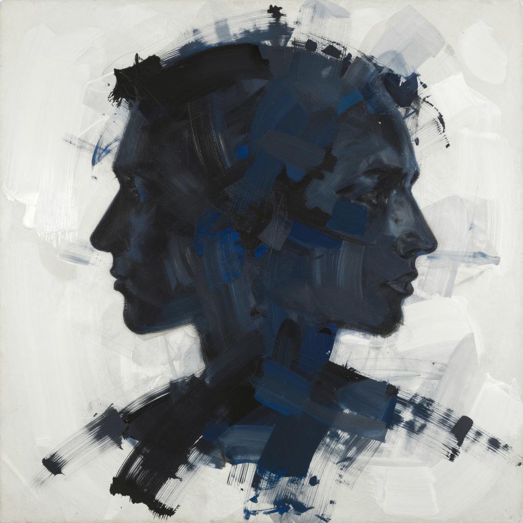 Abstract painting of two overlapping black and white brushstrokes forming human profiles. Dark blue-black brushstrokes dominate the upper and lower sections, creating a sense of depth and contrast. The brushstrokes envelop the white background, blending and merging the forms. One profile is more defined with a clear nose and chin, while the other is more abstract. The brushstrokes are thick and ured, with visible strokes and layers. The overall style is modern and abstract.
