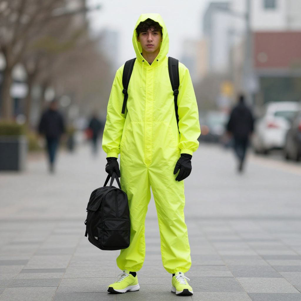 Neon yellow costume, 1boy, male focus, solo, hood, outdoors, backpack, gloves, hood up, blurry, full body, hands in pockets, bag, looking at viewer, jumpsuit, standing, shoes, blurry background