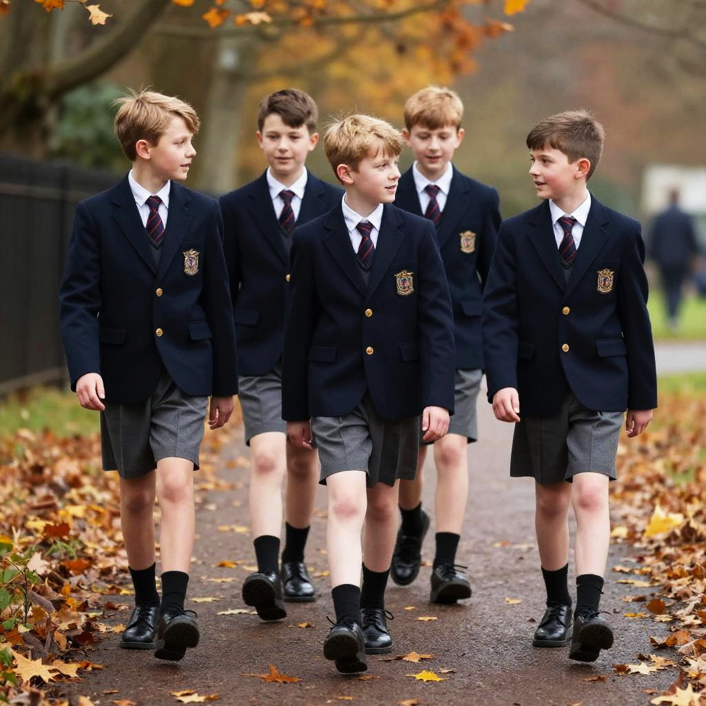 British schoolboy uniforms, modern take with slim-fit blazers and tailored shorts, bright colors and clean lines, boys reading books under big oak trees outside a grammar school, high detail
