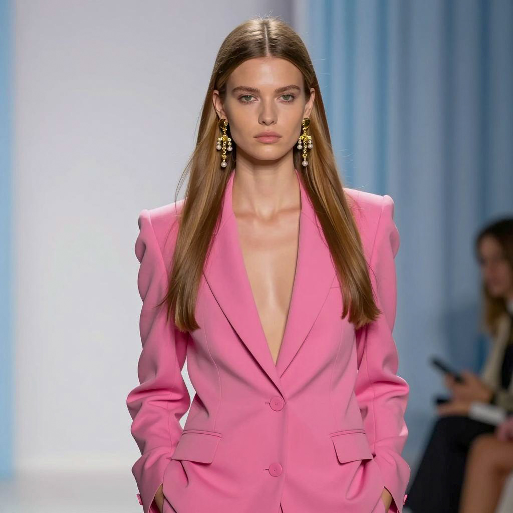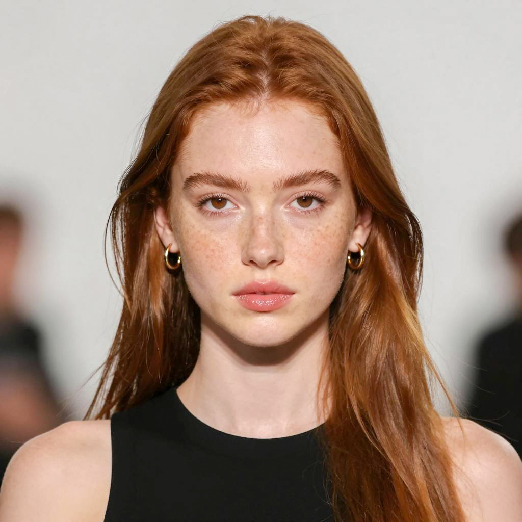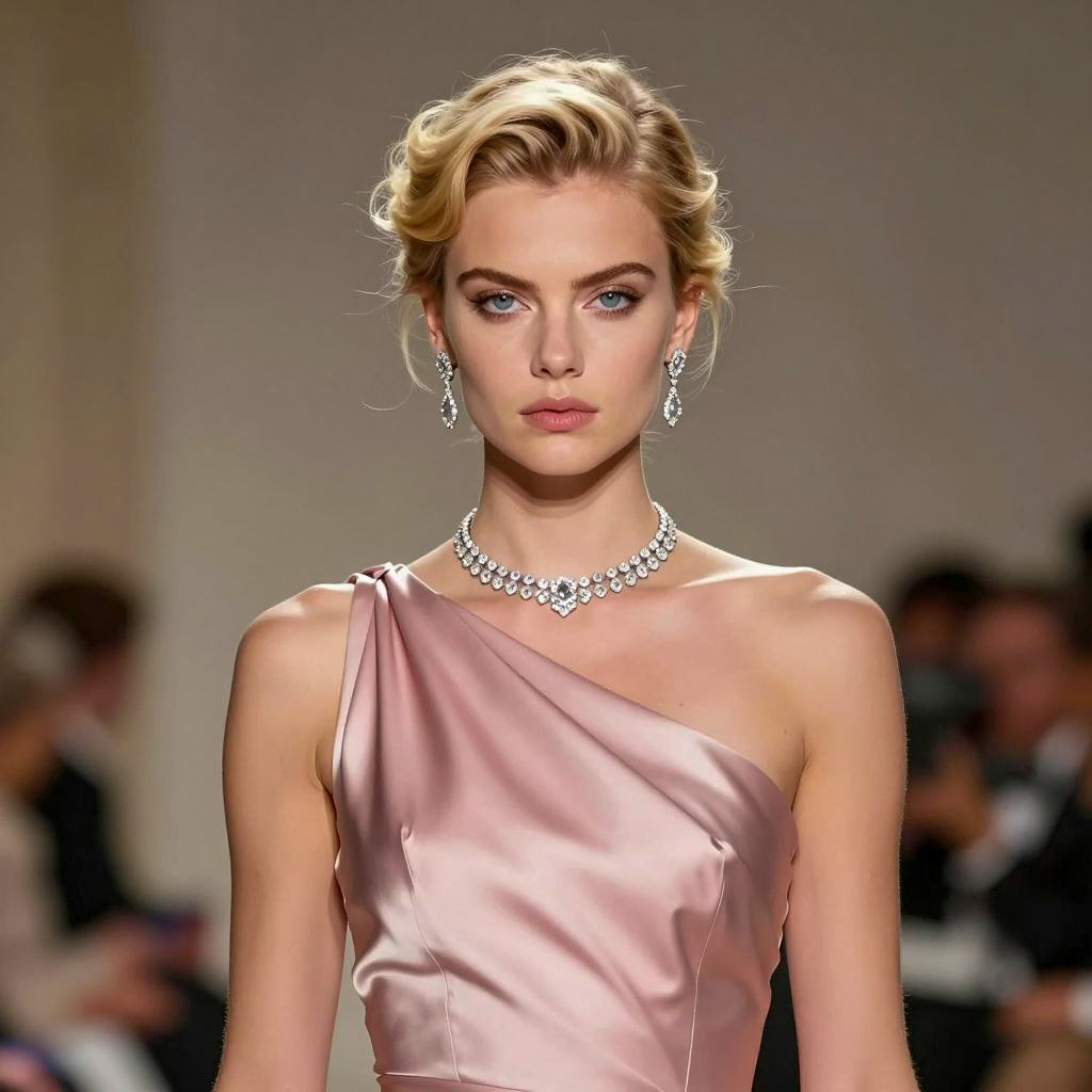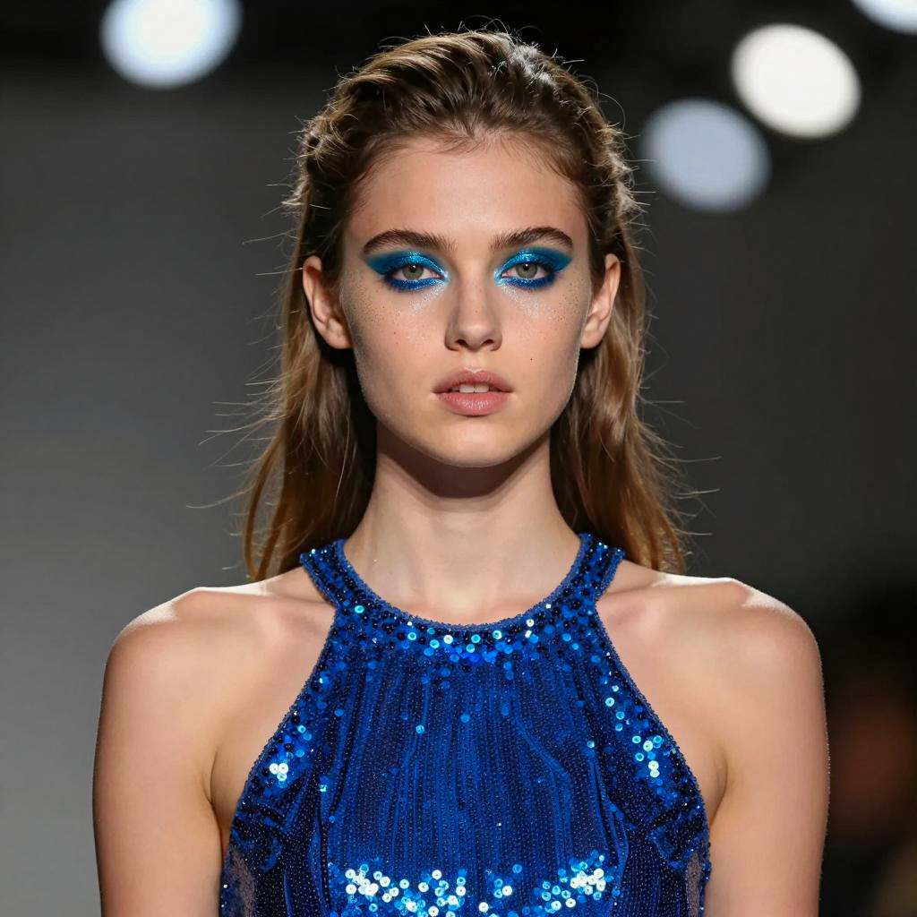 Photograph of a young woman with light skin and brown hair in a ponytail. She wears a sparkling, blue, sleeveless dress with a high neckline, covered in sequins. Her eyes have blue glittery eyeshadow and shimmering dust on her cheeks. Background features blurred bokeh lights. She has full lips with neutral makeup. Her expression is neutral, slightly open-mouthed. The woman is centered, facing forward.