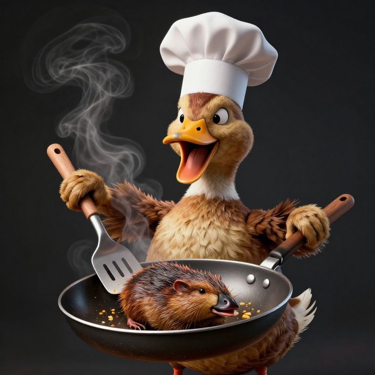 In this highly detailed and imaginative scene, an angry duck chef, with a determined expression on its face, is depicted in the midst of a cooking endeavor. The duck, with realistic and textured feathers, is holding a frying pan and a spatula, with steam rising from its head and its beak open wide, as if in mid-roar. The duck is cooking a nutria, which is also depicted with realistic details and textures, in the pan. The nutria's fur is detailed and lifelike, adding to the scene's realism. The frying pan is metallic with wooden handles, and the spatula is wooden, both contributing to the scene's overall authenticity. The background is dark, creating a dramatic contrast that highlights the duck and its actions. The spatial relationships are dynamic, with the duck positioned centrally, the pan and spatula to its sides, and the nutria being cooked within the pan. The interplay of colors, textures, and shapes creates a visually rich and engaging composition.