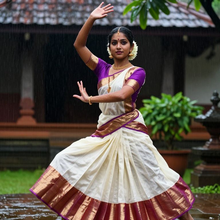 Photograph of a South Asian woman dancing in the rain. She has medium brown skin, dark hair in a bun adorned with yellow flowers, and wears a traditional white and maroon saree with a purple blouse. Her gold jewelry and bangles shine against the raindrops. She is mid-movement, with one arm raised and the other extended, in a lively, graceful pose. The background features a traditional wooden house with a tiled roof and green foliage, slightly blurred due to the focus on the dancer. The ground is wet, reflecting the rain. The image captures the vibrant colors and cultural elements beautifully.