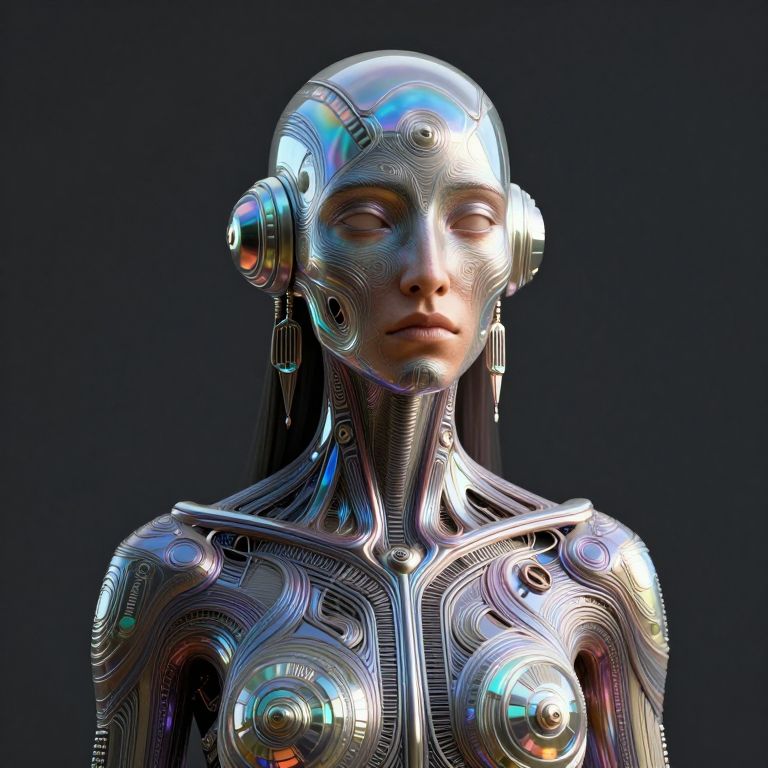 This is a highly detailed CGI image of a futuristic, humanoid robot with a metallic, glossy skin. The robot has a bald head with intricate, circuit-like patterns and glowing blue and orange highlights. Its face is androgynous, with soft, expressionless features and large, reflective eyes. The robot's ears are cylindrical and embedded with small, glowing components. The upper body is adorned with complex, swirling designs and circular, jewel-like ornaments that emit a subtle light. The background is a solid, deep black, making the robot's metallic sheen and colorful accents stand out prominently. The image has a sci-fi, cybernetic aesthetic.