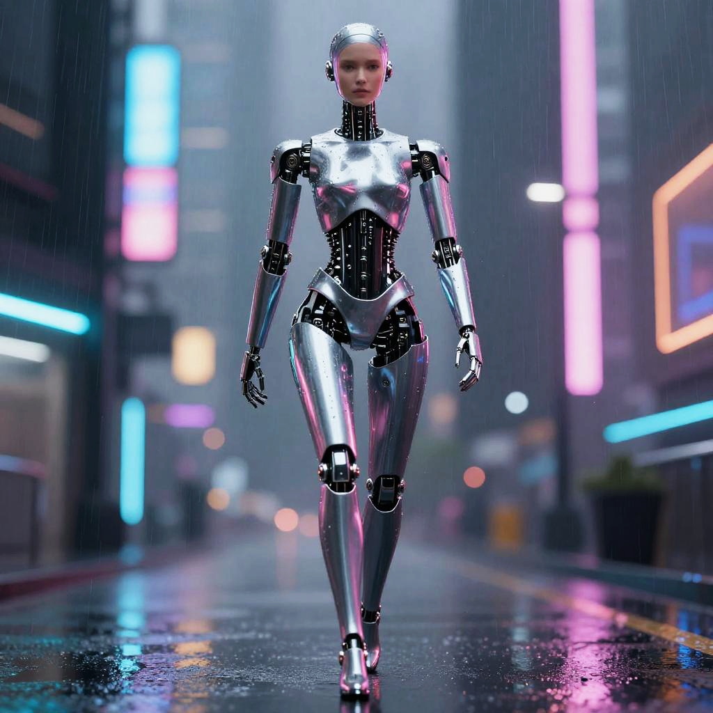 AI full body female robot model walking through a digital rain environment, smooth chrome surfaces with subtle light reflections, elegant design with flexible joints, immersive neon-colored city backdrop, hyper-realistic futuristic art style