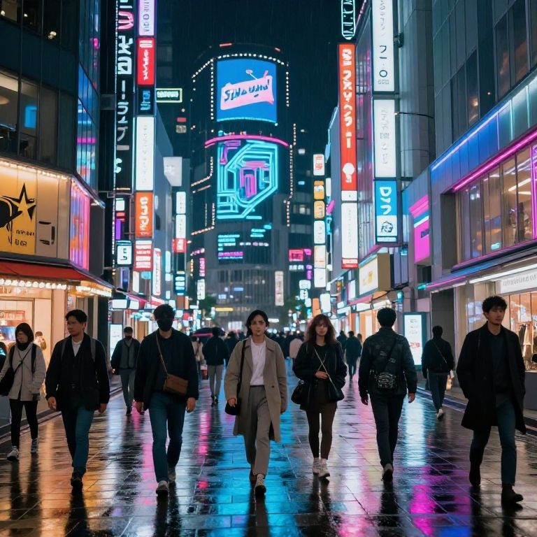 Japanese street scene at night with vibrant neon signs in kanji, bustling crowd with diverse fashion styles, ramen stalls emitting steam and warm light, reflections on wet pavement, mix of modern and traditional architecture, lively and colorful urban energy.