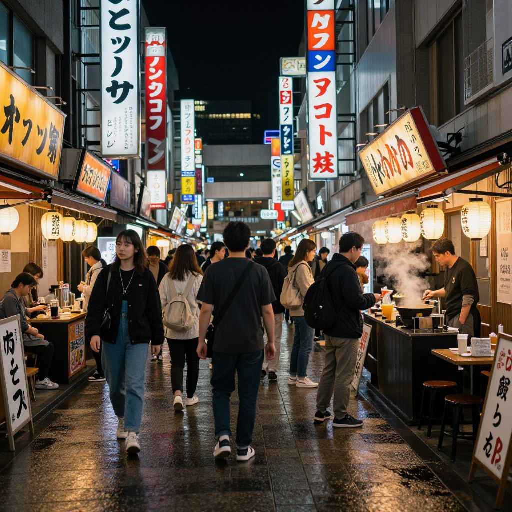 Photograph of a bustling Japanese street at night, featuring a narrow alley lined with brightly lit, colorful neon signs in Japanese. The wet, reflective pavement suggests recent rain. People, predominantly young adults, walk and dine at various small restaurants on either side. The restaurants have warm, glowing lanterns and steam rising from grills. Diners wear casual attire, including jeans, jackets, and sneakers. The alley is flanked by modern buildings, and the vibrant signs create a lively, urban atmosphere. The image captures the energetic, cultural essence of a nighttime street food scene in Japan.
