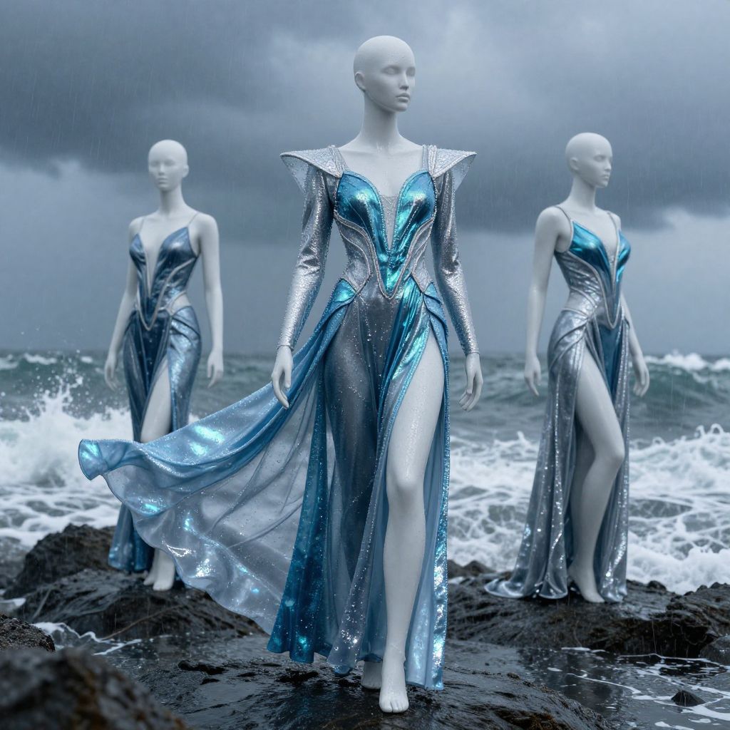 Photograph of three bald, white, featureless mannequin figures standing on dark, rocky shore with turbulent waves in the background. Each wears a shimmering, metallic silver-blue gown with high collars and thigh-high slits, reflecting light. The central figure, in the foreground, has a more intricate bodice with a deep V-neck, while the side figures have simpler, flowing designs. The sky is overcast, adding a dramatic, moody atmosphere to the scene. The gowns' textures are reflective and flowing, contrasting with the rough, dark rocks and foamy waves.