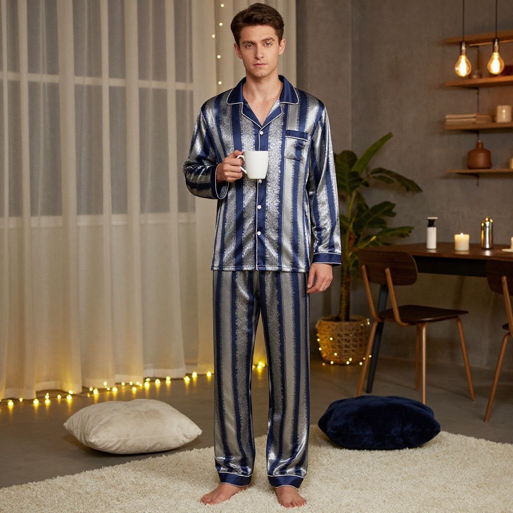 Pajama party outfit male, modern silk pajama set with elegant patterns, deep blue and silver tones, standing in a trendy loft decorated with fairy lights and plush cushions, holding a mug of hot cocoa, capturing a relaxed night in with a chic and comfortable vibe.