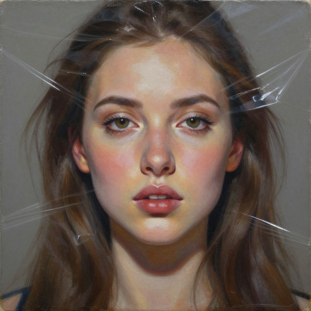 A hyperrealistic, detailed portrait of a woman painted with oil paints, featuring intricate shadows and light, transparent plastic vinyl, and a surreal, glossy style by Michael Parks.