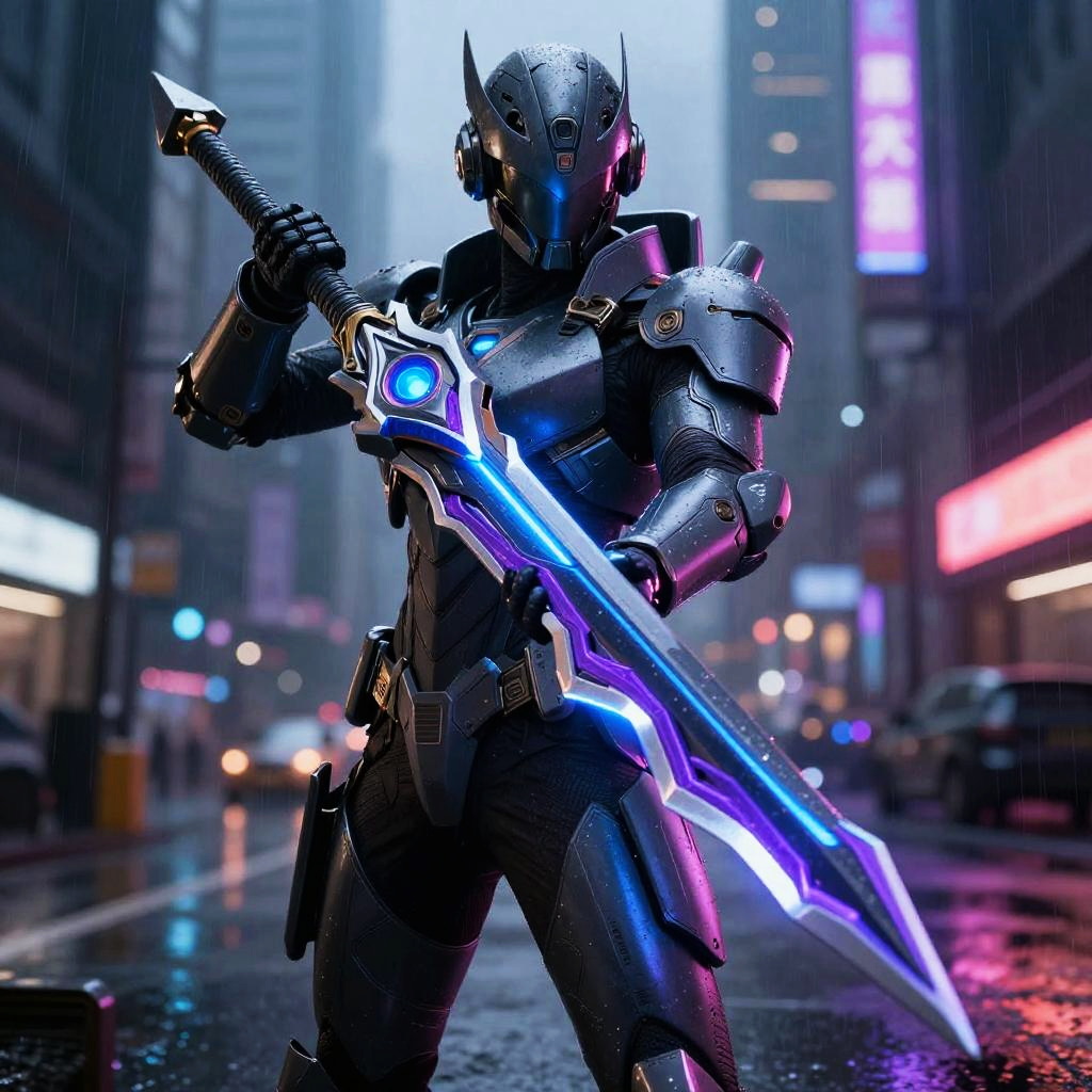 Vel weapon, sleek cyberpunk energy spear, neon blue and purple hues glowing along the shaft, held by a warrior in high-tech armor, urban nightscape with rain and vibrant city lights, cinematic, high detail digital rendering