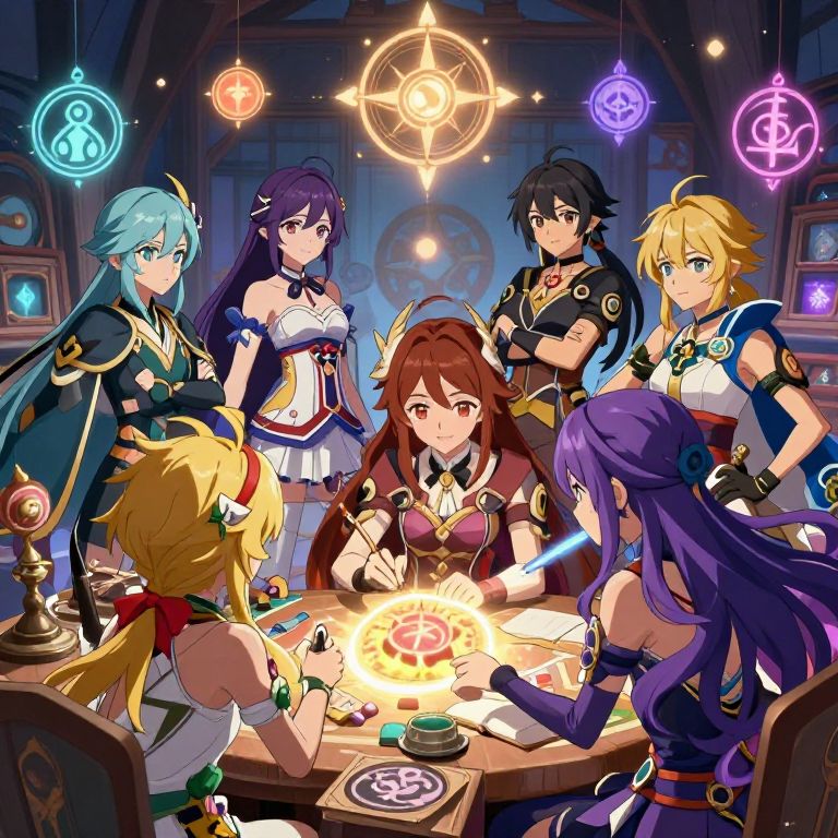 This vibrant digital anime-style illustration features seven characters with diverse hair colors and outfits, gathered around a wooden table in a dimly lit, magical room. Central is a red-haired girl with a white and gold dress, surrounded by five others: a blue-haired girl in black and gold, a purple-haired girl in a blue and purple outfit, a black-haired boy in black, and a blonde girl in a white and blue outfit. They are engaged in a spell-casting ritual, illuminated by glowing magical symbols and orbs hanging from the ceiling. The background shows an old, mystical room with wooden beams and shelves.