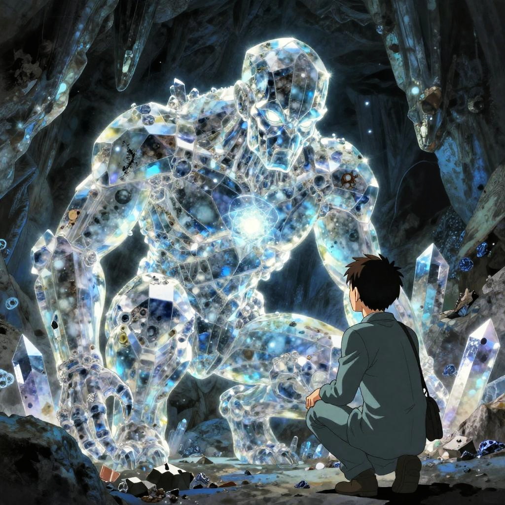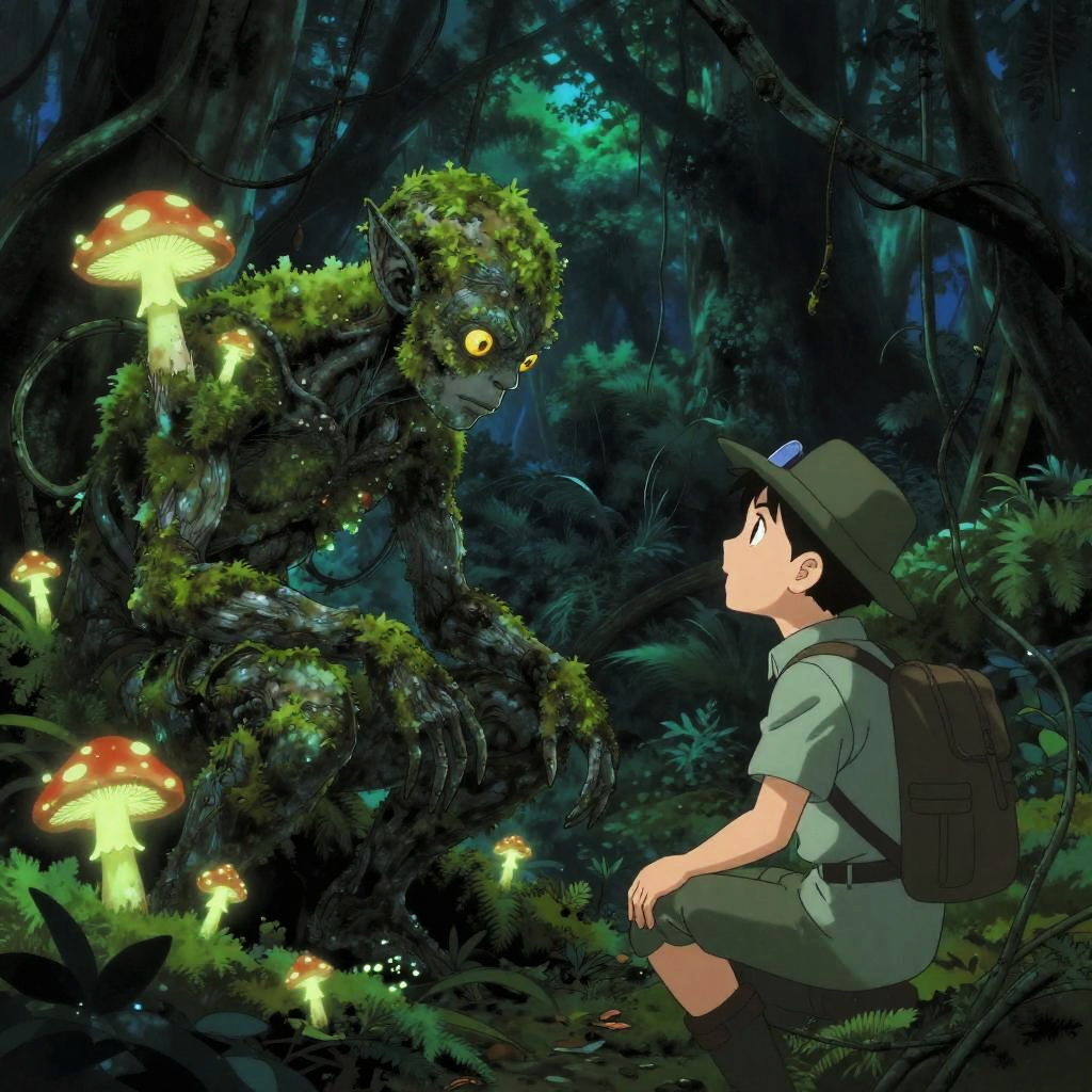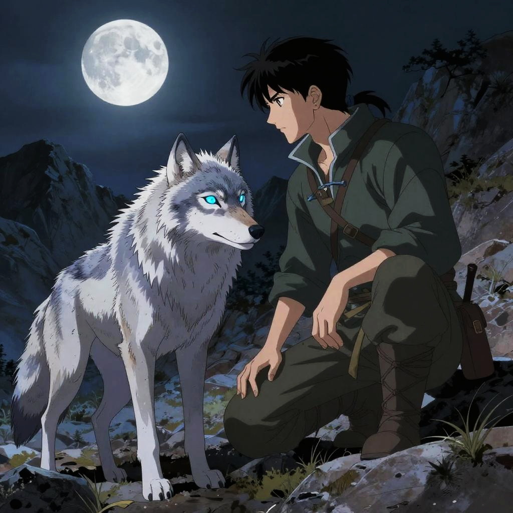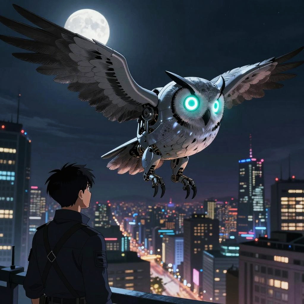 A bio-mechanical owl drone, with sleek metallic feathers and pulsing neon eyes, interacting with a vigilant night watchman, in a sprawling futuristic cityscape under moonlight, depicted in the surreal and dark anime style of Q Hayashida.