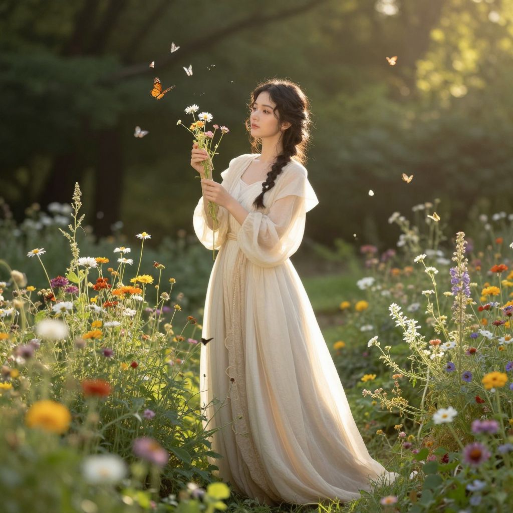 A woman in a flowing gown stands amidst a vibrant garden, cradling a sprig of wildflowers as butterflies flutter around her, bathed in the golden light of a serene forest clearing.