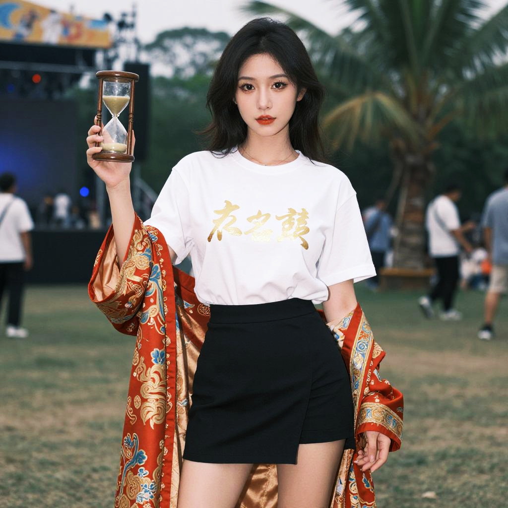 A Hourglass woman in a casual chic outfit featuring a white graphic t-shirt with gold foil lettering and a black mini skirt, stands at a music festival in a botanical garden, captured in a lithographic film style. Sexy. Pretty face and beаutiful eyes. Big breasts BREAK chinese, asian, traditional Chinese aesthetics, delicate brushwork, ink wash painting textures, vibrant red and gold accents, elegant Asian female, silk fabrics, ornate patterns, soft lighting, ethereal atmosphere