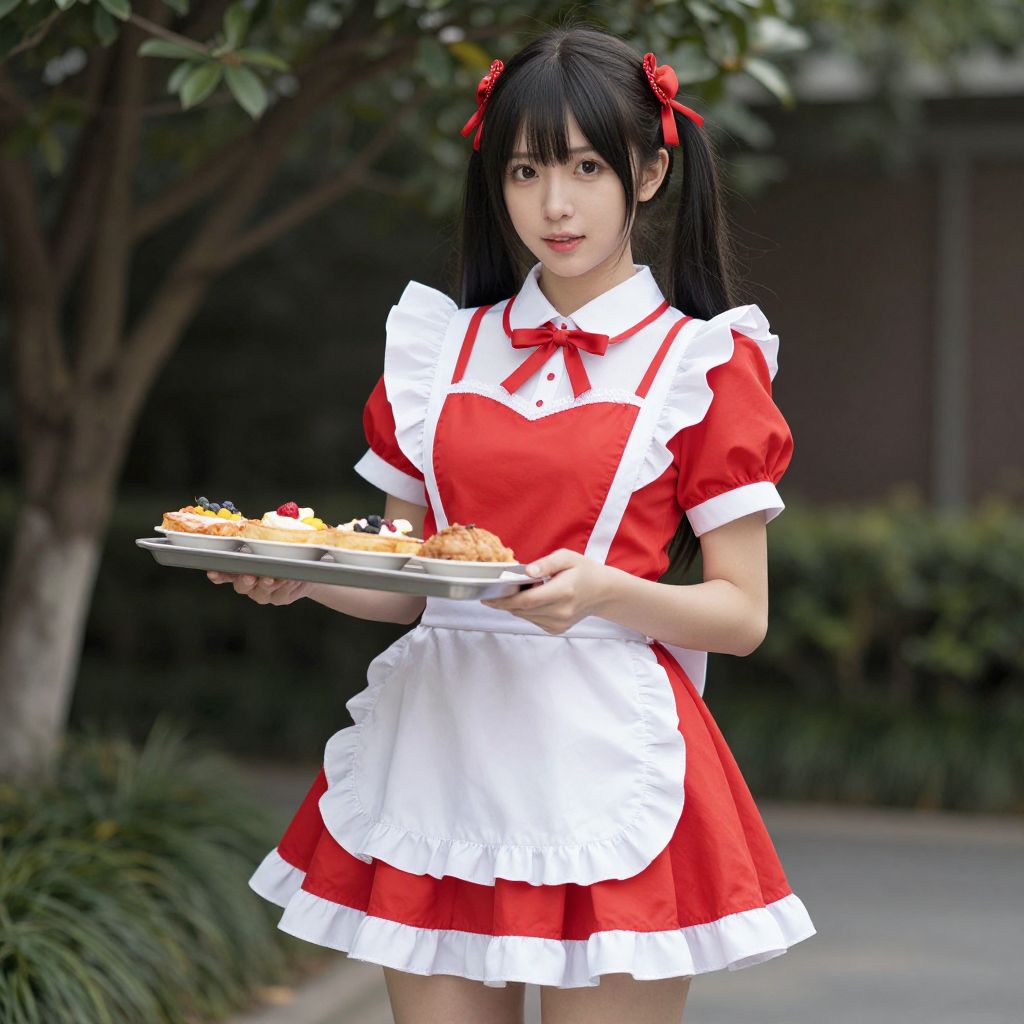 Red Maid Outfit, woman in red and white dress holding a tray of food
