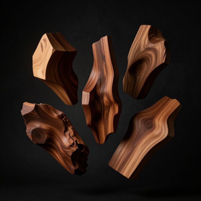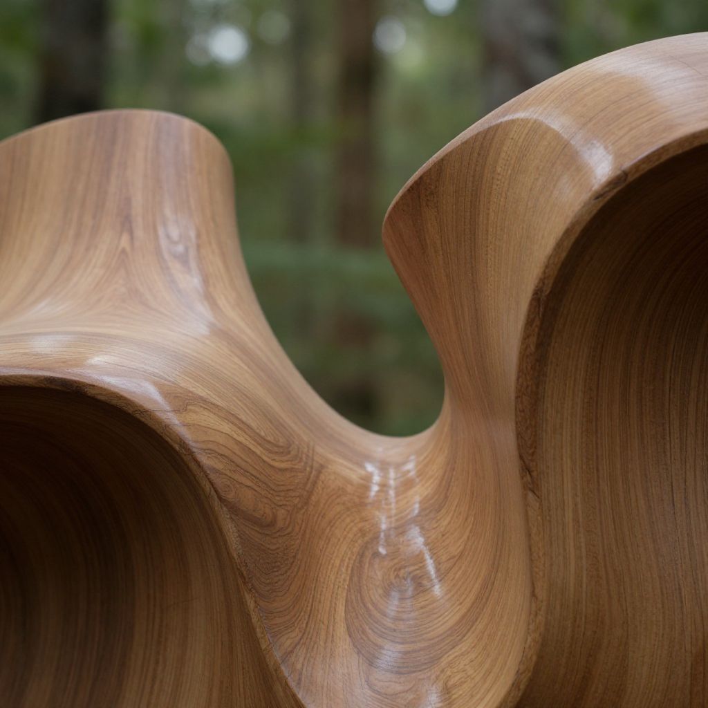 Close-up of elegant woodforms shaped into flowing, organic curves resembling natural sculptures, with polished surfaces reflecting gentle sunlight filtering through a forest canopy, evoking harmony between nature and art, ultra-realistic rendering.