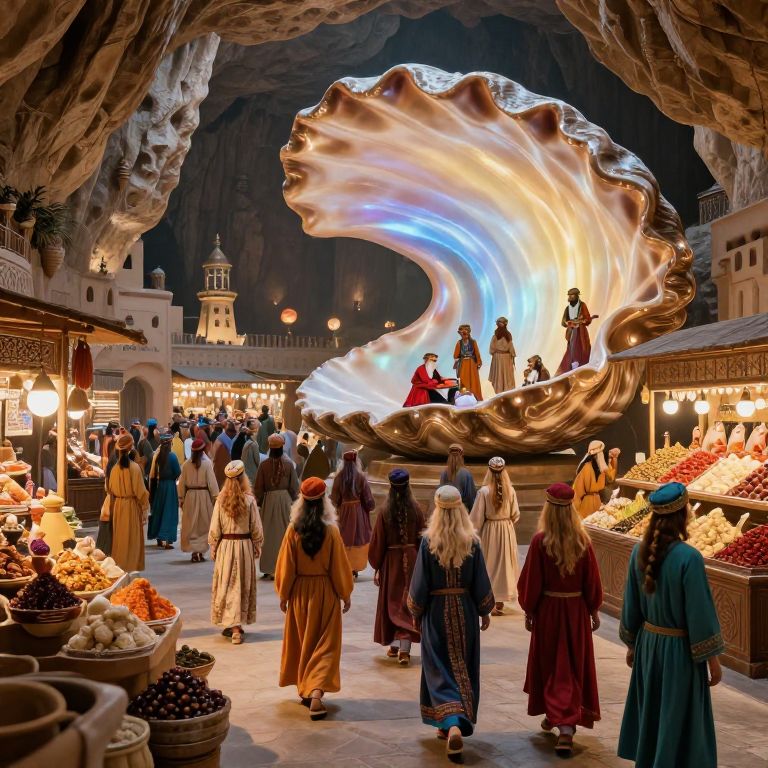 Futuristic bedouin elves in colorful garb crowd a medieval grand bazaar inside a cavernous nacre shell, volumetric light, colorful desert garb, spice market,