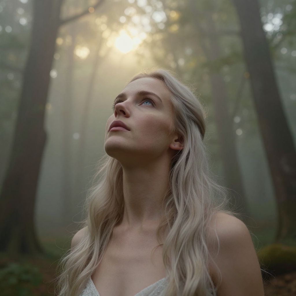 A hyperrealistic portrait of a European woman in her late twenties showcases ethereal beauty with delicate features, ice-blue eyes, and silvery blonde hair cascading to her waist. Set against an ancient forest glade shrouded in mist, she stands illuminated by soft golden sunlight filtering through the dense canopy above. Captured from a unique low-angle perspective, the portrait emphasizes the graceful arch of her neck and shoulders as she gazes upward with a serene expression that evokes tranquility and introspection. This emotional gradient invites viewers to contemplate timeless mysteries, nature's wonders, and humanity's place within it.