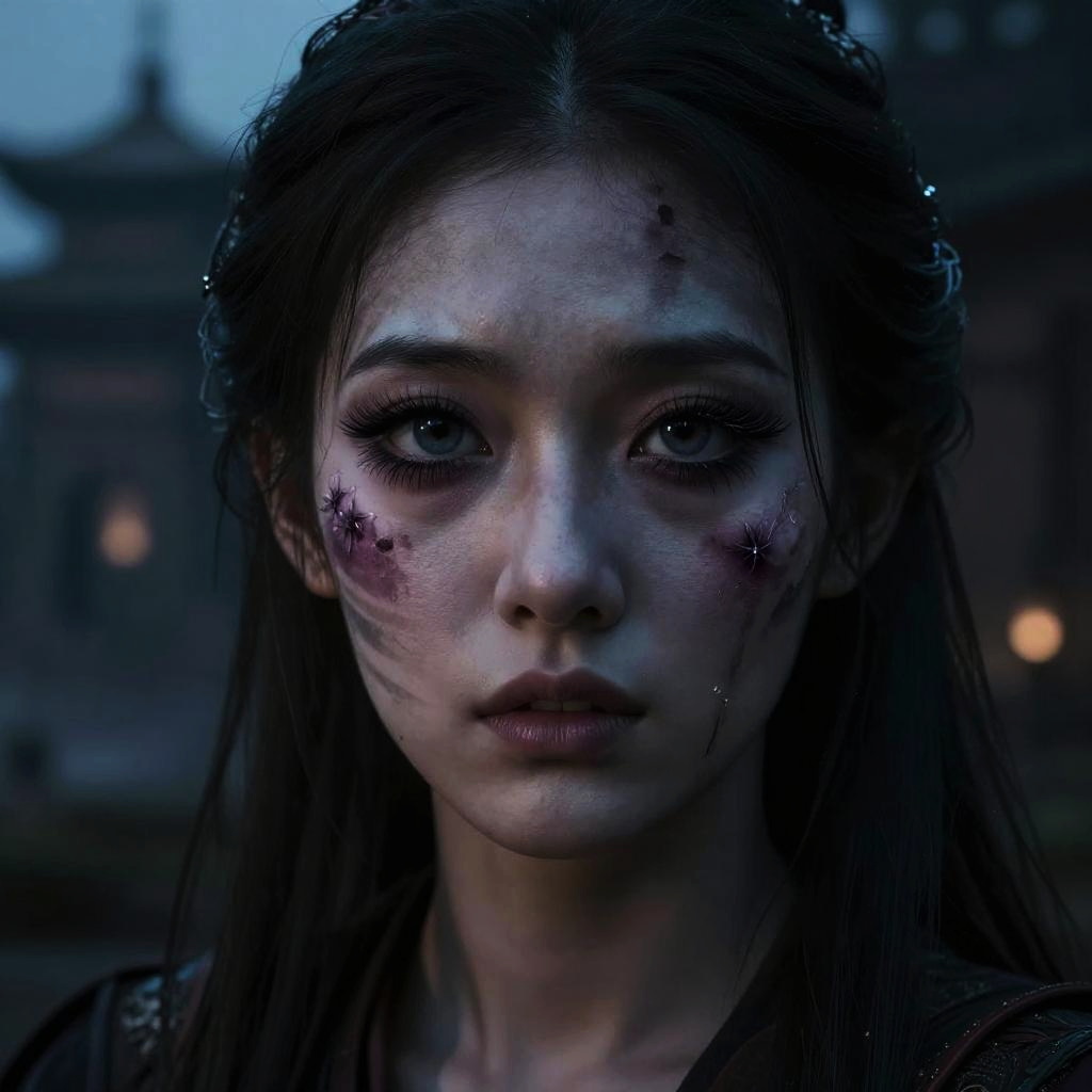 Close-up portrait of an Asian woman with long dark hair and ethereal gray eyes, featuring dramatic ruined makeup with smudged mascara and bruising effects on her cheeks, set against a misty monastery background at dusk. The image has a cinematic, post-apocalyptic atmosphere with chiaroscuro lighting and volumetric bloom effects, emphasizing intricate facial details and deep focus.