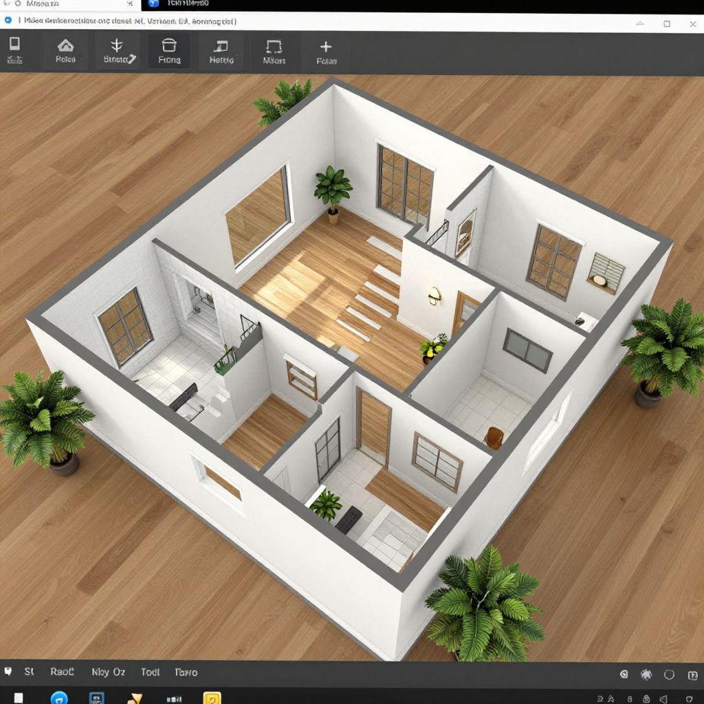 Floor plan maker visualization of a spacious open-concept home layout, with labeled living spaces, realistic textures, including hardwood floors, tiled bathrooms, 3D plants, natural lighting effects, and intuitive user controls displayed on screen, detailed and artistic digital architectural rendering.