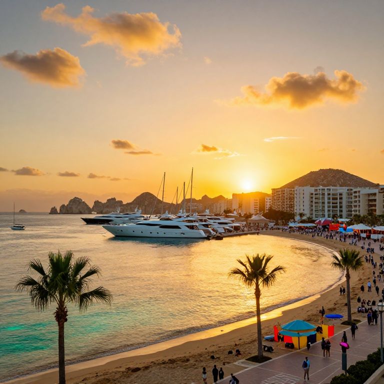 Cabo at sunset, vibrant golden sky reflecting over tranquil turquoise waters, luxury yachts docked at marina, palm trees swaying gently along sandy beaches, lively boardwalk bustling with tourists, bright fiesta colors, high detail, cinematic lighting