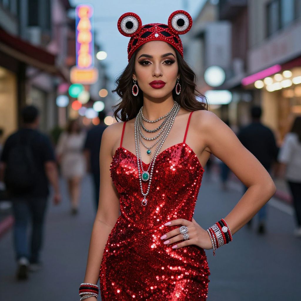Vibrant red sequined dress gleams under neon lights as a woman poses confidently in front of a bustling street scene, adorned with a matching headpiece featuring two eye-like embellishments and layered necklaces, while her hand rests gracefully on her hip, showcasing intricate bracelets and rings.