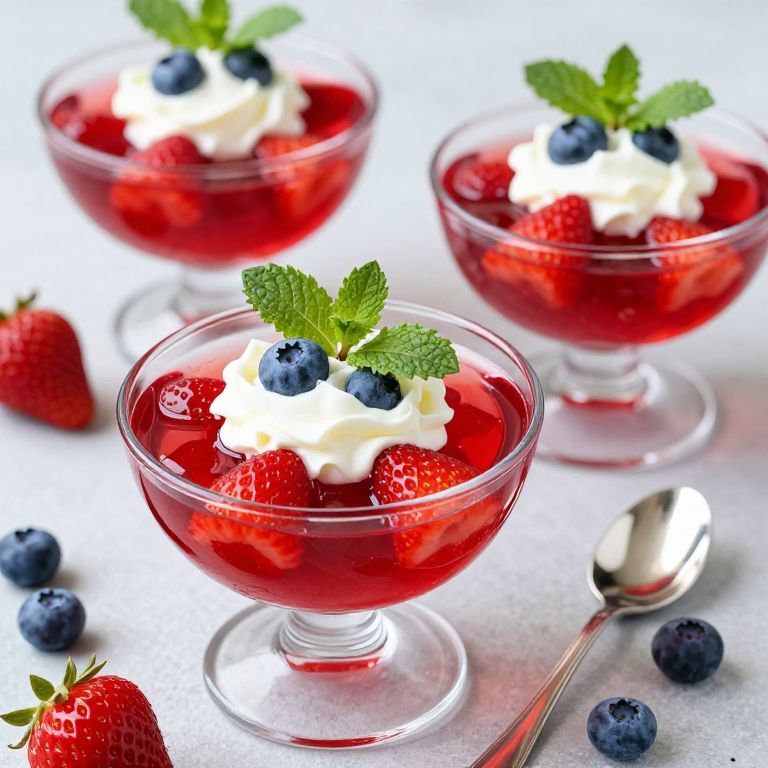 Glistening glass bowls filled with vibrant red strawberry jellies topped with creamy whipped cream, fresh blueberries, and mint leaves, accompanied by a shiny silver spoon and scattered berries on a light gray surface, perfect for outdoor entertaining.