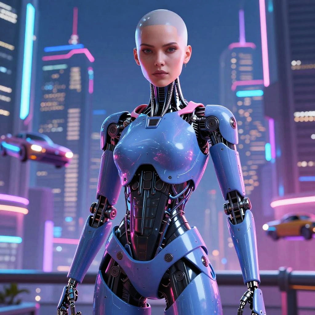 A futuristic, CGI-rendered image of a bald, female android with a sleek, metallic body in shades of blue, pink, and purple. She stands confidently in a neon-lit cityscape with flying cars and illuminated skyscrapers in the background. Her expression is serious, and her eyes are strikingly focused. The scene is vibrant with a cyberpunk aesthetic, highlighting the high-tech, urban environment.