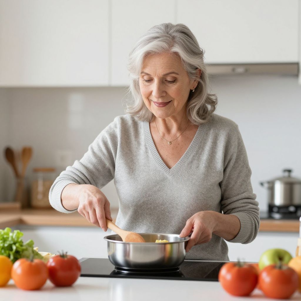 Photograph of an elderly woman with short, gray hair, wearing a light blue apron over a gray long-sleeve shirt, slicing a yellow bell pepper on a wooden cutting board in a bright, modern kitchen. The background features white cabinets and a blurred stovetop with a pot. In the foreground, there are fresh tomatoes and green leafy vegetables. The woman's focused expression and the natural light enhance the scene's warmth and clarity.