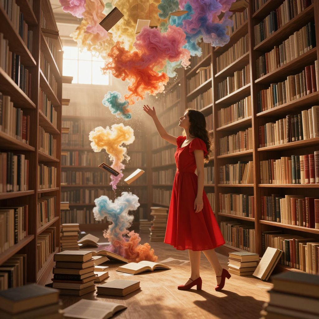 In a surreal, computer-generated library bathed in golden-hour light, a woman in a vibrant red dress stands amidst scattered books, reaching toward floating puffs of color that rise like living dreams from the pages below, creating a whimsical and ethereal atmosphere.