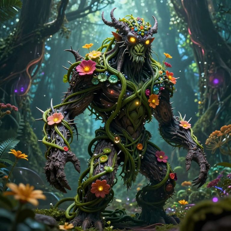 Fantasy plant monster art featuring a towering creature with vines and glowing flowers intertwined with thorny bark, vibrant colors, surreal atmosphere, mystical forest background, intricate details, cinematic lighting, ultra-realistic style.